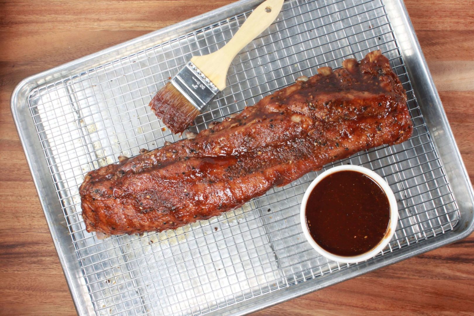 Remove the ribs form the oven and discard the aluminum foil. Brush both sides of the ribs with BBQ sauce and return to the oven. Set the oven to broil for 4-5 minutes to caramelize the sauce.
